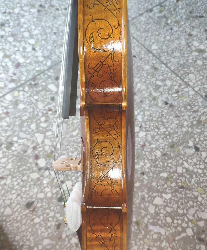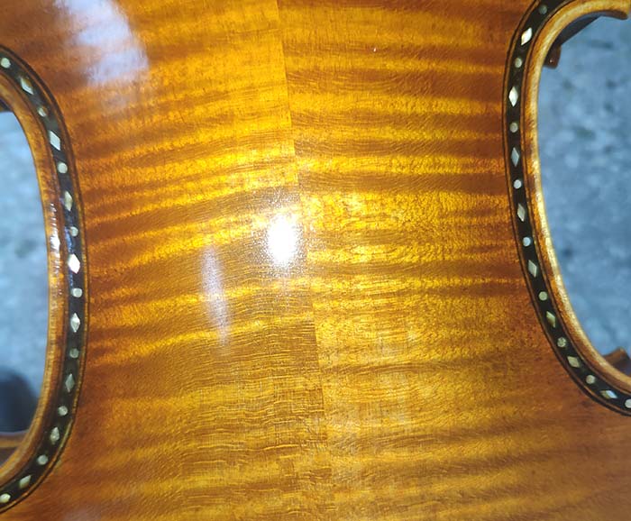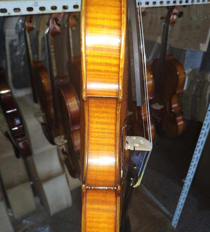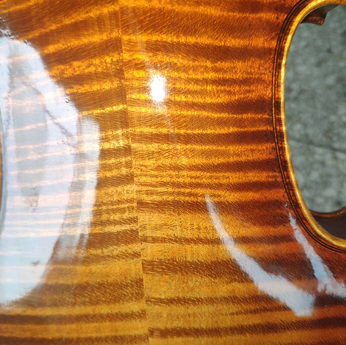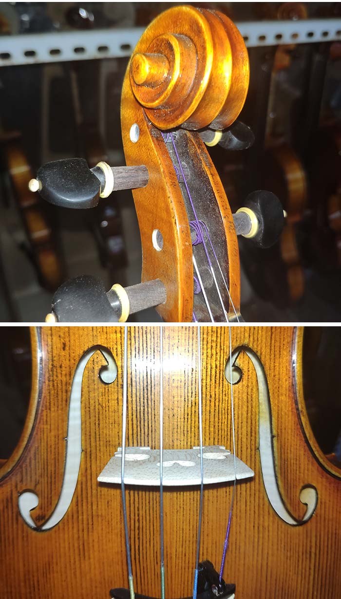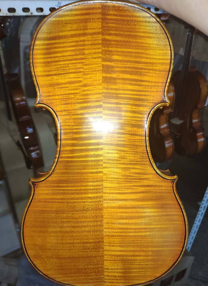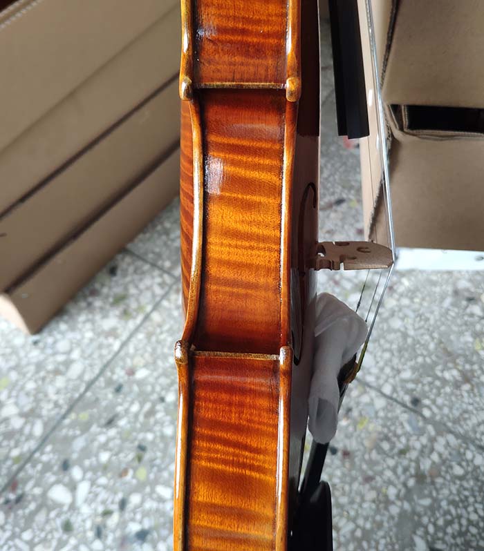 描述:一款非常精致的歐料小提琴,側(cè)板和琴頭有雕花,琴的邊緣有貝殼的鑲嵌。面板的木紋寬度在2-3毫米,背板為均勻的歐洲楓木。琴的邊緣部分油漆顏色較淺,中間部分的油漆偏深。這把琴音質(zhì)非常棒,非常甜美輕盈的感覺,專業(yè)演奏者的標(biāo)配。