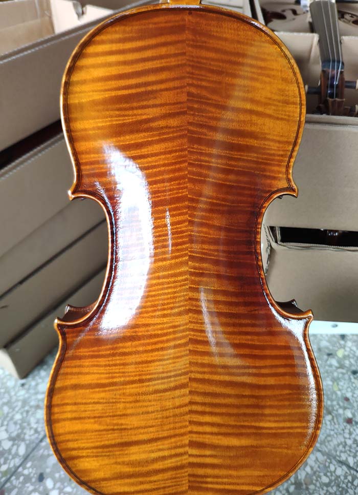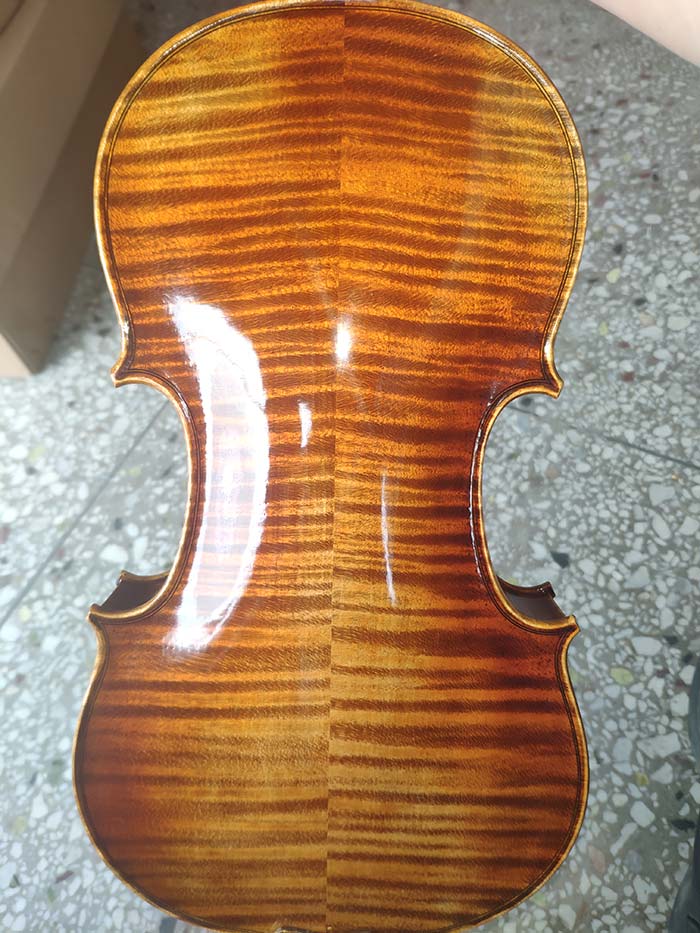 描述:這把琴背板采用的是加拿大楓木,面板為瑞士進(jìn)口云杉木,木質(zhì)都是比較均勻的那種,選材非常講究。油漆顏色偏紅偏暗,有輕微的仿舊處理,音質(zhì)也是相當(dāng)?shù)陌簦梢哉f是標(biāo)準(zhǔn)的演奏級(jí)別小提琴,大家如果喜歡歡迎隨時(shí)留言給我。